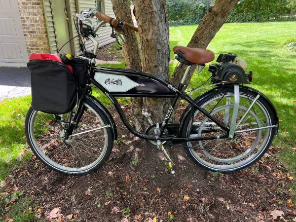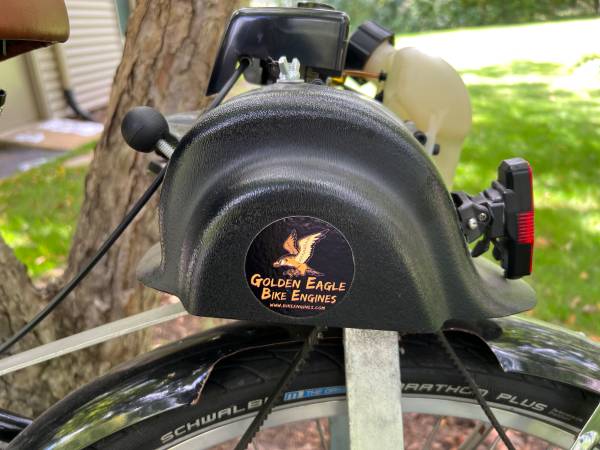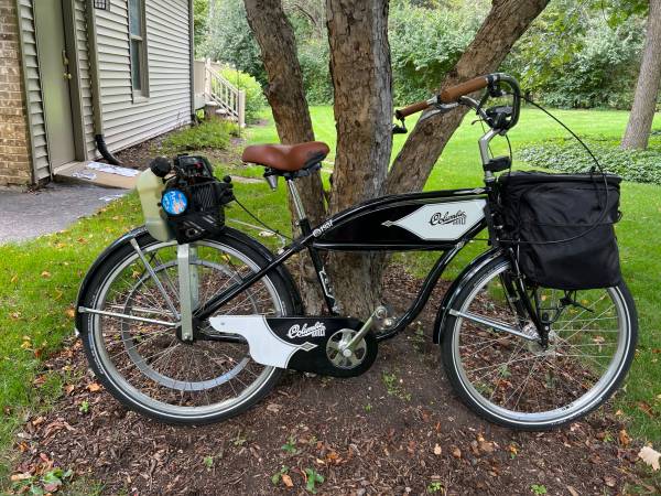 High quality 2 cycle gas powered bike, gas oil mix 50:1, Kevlar belt drive with extra belt, high quality rims with stainless steel spokes for durability, front drum brake, marathon tires, 115 miles per gallon, carries fuel for unlimited distance. 25mph max speed, perfect condition.