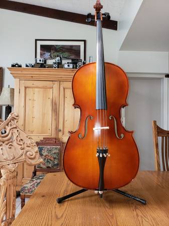 Beautiful - Brand New 4/4 Cello with Horsehair Bow, Case and Cello Stand - Intermediate Model. Professionally set up for Band and Orchestra.