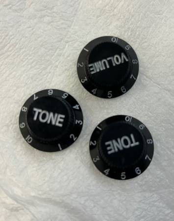 2 sets available (1 white and 1 black) $1 each set Brand new Black with white lettering Or White with gold lettering 2 tone knobs / 1 volume knob For Strat models and offsets