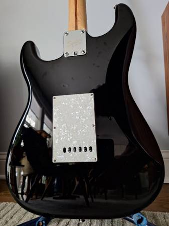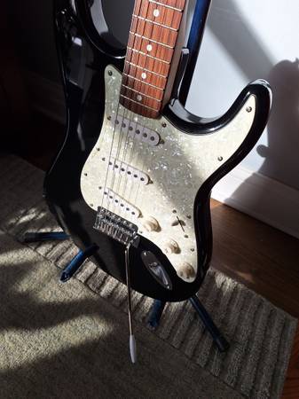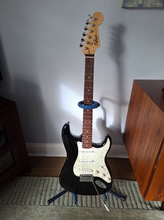 2007 Squier Stratocaster Special Edition (SE) black gloss with white pearloid pick guard. These SE models are coveted for their high quality features. This model features a full-thickness agathis body, a wide and chunky C-shape maple neck with skunk stripe, a clean rosewood fretboard, 25.5 scale length, chrome and die-cast squier tuners, a synchronous tremolo bridge, 21 medium jumbo frets. Equipped with three single-coil pickups and a 5-way selector switch, this guitar offers several versatile tones ranging from classic strat chimes to warm hums.