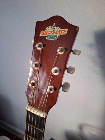 Cool and collectible vintage circa 1960s-70s acoustic guitar by Checkmate, model G-425. Made in Korea, this guitar has a bat-winged style black double pickguard with etched graphic details, walnut fingerboard, mother of pearl inlay position markers, and a steel-reinforced neck. It sports a graphic “Checkmate” emblem and “Steel Reinforced Neck, Made in Korea" label to the headstock and “Model No. G-424” to the interior of the sound chamber. Likely crafted in Korea by Teisco (or Kwai) with Checkmate branding upon import between 1960-70, this vintage guitar is a testament to the unique esthetic and craftsmanship of a bygone era.