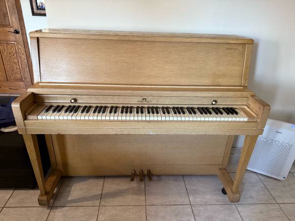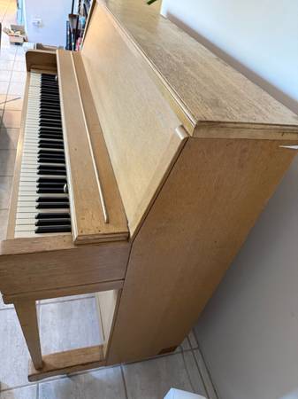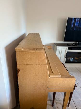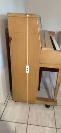 Used upright piano. Has significant cosmetic damage but works fine. Could use a tuning. The piano is free to a good home. You can also have the piano bench. You would need to have piano movers move...