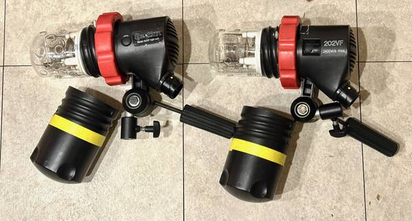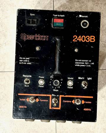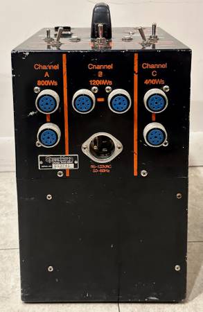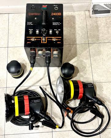 Speedotron 2403B Power Supply Pack, (2) Speedotron 202VF Strobe Heads with cords, (2) 7" umbrella style reflectors, and 2 protective flash cover cones. All works just fine. Very good pre-owned condition. Downsizing studio and letting go all of Speedotron Lighting Equipment. Have several more Packs,102 Flashheads, 202VF strobes , grids, reflectors, etc. There is NO POWER CORD with the power pack. Plugged it the pck with an extension cord to show power on. ONLY WHAT IS PICTURED IS FOR SALE. . Thanks.