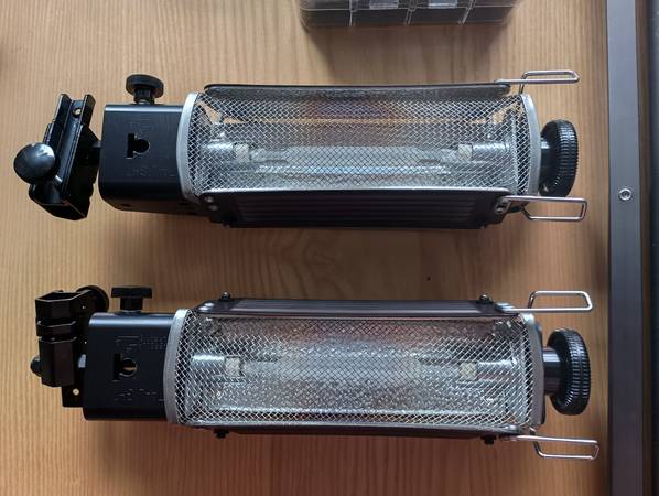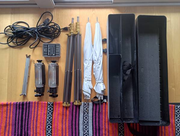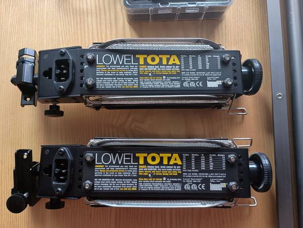 Set of 2 Lowel Tota lights for photo/video. 2 lights, cables, stands, umbrellas, one spare bulb. All packs in hard clam case. Used but in excellent working condition. Asking $35.