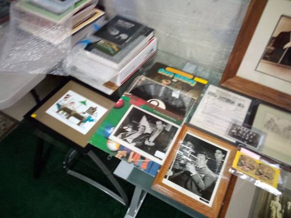 Approx. 600 billiard items available, ONE LOT, package deal. Ephemera, art, posters, 60 cues, tokens, gum cards, medals, real 1940's player Press photos, billiard irons, Eagle Brass Q locks, BBC cue racks, balls, gadgets.