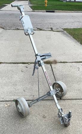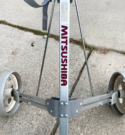 MITSUSHIBA Golf Cart 2 wheeled push cart Carrier for easy golf bag transport. Large wheels, writing pad, and collapsible. Very good + pre-owned condition. Thanks.