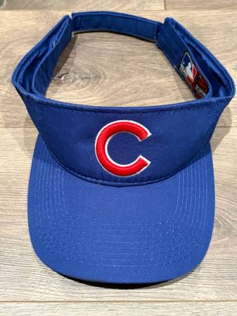 This CHICAGO CUBS royal blue visor has the puffed "C" embroidered letter in red and with white outline. The underside of the bill is gray color. The Team MLB logo is on the left side, and "Cubs" embroidered in cursive on the back of the adjustable velcro strap. It is One Size Fits Most and is made by OC Sports.