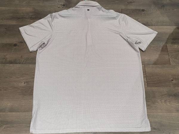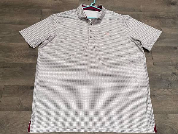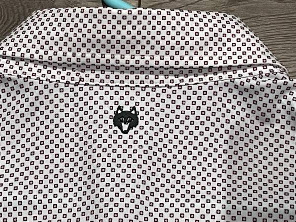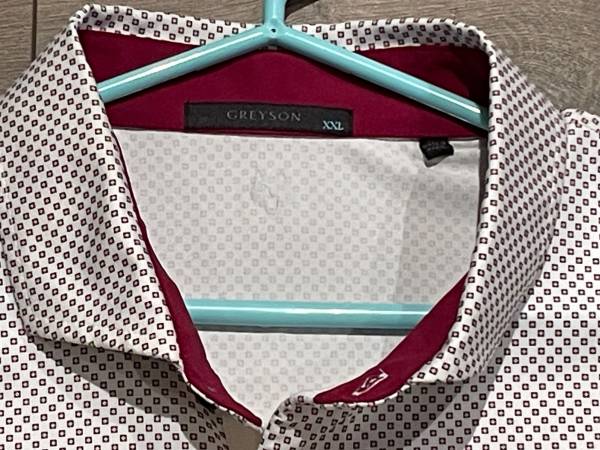 GREYSON Dream Weaver white with small square print, burgundy accents, and 3-button placket. Greyson Fox raised logo on upper center back. B M Golf & Country Club (Blue Mound in Wauwatosa, WI) embroidered in pink on left chest pocket. Extra button attached to inner tag. 90% polyester/10% Spandex--$24.
