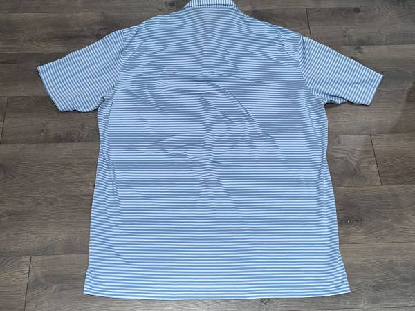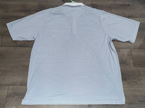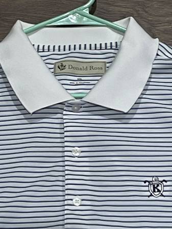 DONALD ROSS white with thin dark and light blue horizontal stripes,, and 3-button placket. "K" embroidered in dark blue on left chest pocket for Knollwood Club in Lake Forest, IL. Extra button attached to inner tag. 100% polyester--$18.