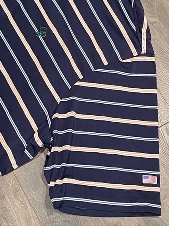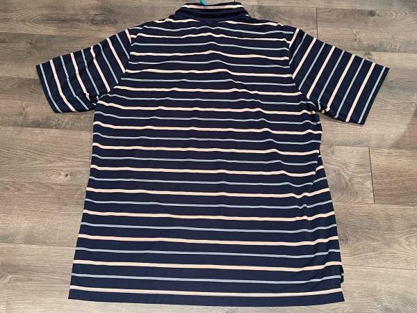 F&G (Fairway & Greene) TECH dark navy blue with orange, light blue and white horizontal stripes, and 3-button placket. "CP" embroidered in evergreen on left chest pocket for Calusa Pines Golf Club in Naples, FL. There is also a USA flag embroidered on left sleeve. 94% polyester/6% Spandex--$24.