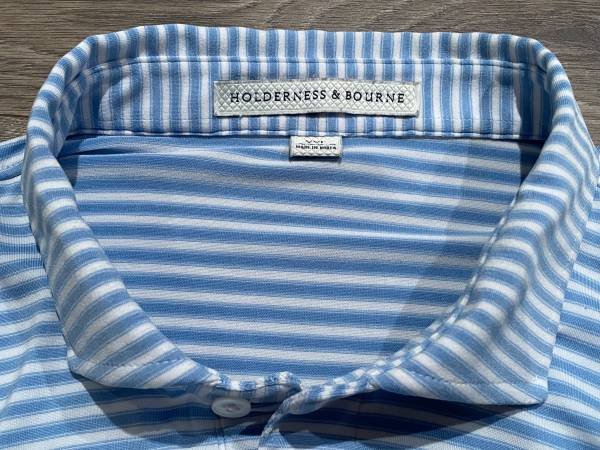 HOLDERNESS & BOURNE white with light blue horizontal stripes and a 3-button placket. B M Golf & Country Club (Blue Mound in Wauwatosa, WI) embroidered in navy on left chest pocket. Extra button attached to inner tag. 92% polyester/8% elastane--$14.