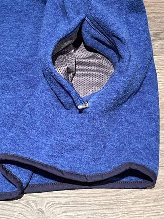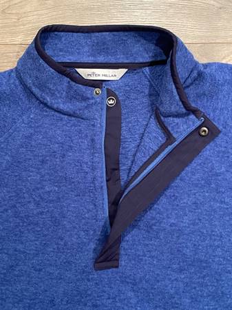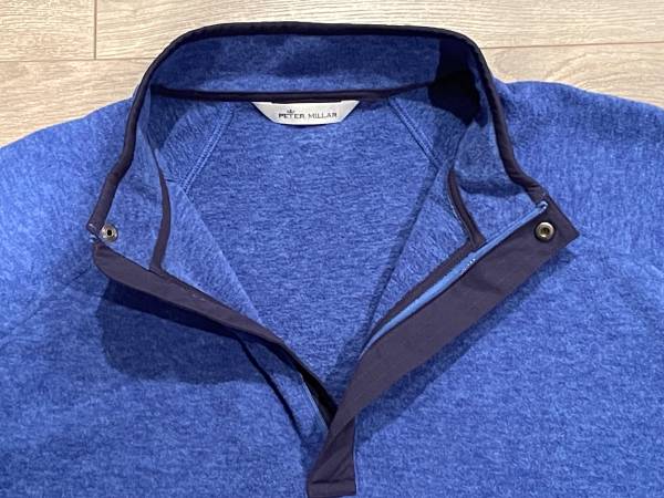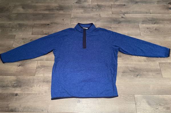 Luxury performance sportswear and prestigious resort apparel PETER MILLAR brand clothing is known for its fine craftsmanship. This "York" Men's XXL half-zip, long-sleeve pullover offers remarkable softness and ideal warmth for cooler weather. Its easy-care, heather blue microfleece fabric is comfortable to wear. Features black trim on a hidden placket that hides the half-zip opening, snap top, and trim at the bottom of the sleeves and hem. It has two large functional zippered side pockets for keeping hands warm or holding items. Peter Millar's signature CROWN logo on the upper center of the backside. This is a nice-looking, versatile layering piece of clothing for upscale athleisure wear.