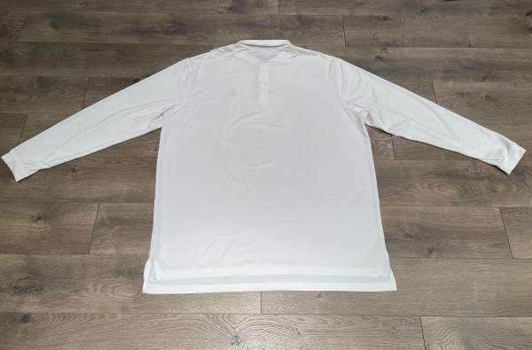 Luxury performance sportswear and prestigious resort apparel PETER MILLAR brand clothing is known for its fine craftsmanship. This plain white, long-sleeve polo has an evergreen embroidered logo from exclusive Calusa Pines Golf Club in Naples, Florida. It is constructed from signature stretch jersey fabric that offers four-way stretch, easy-care, wicking, quick-dry, odor control and UPF 50+ sun protection in a cool-weather friendly style. This shirt is finished with a nice collar and a three-button placket. An extra button is attached to the inner seam tag. This multi-season shirt is a versatile piece of clothing to wear alone or underneath layered pieces, for playing golf or not!