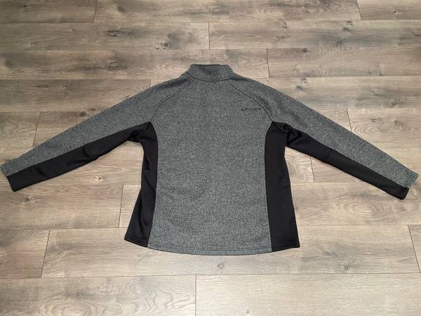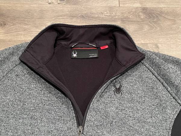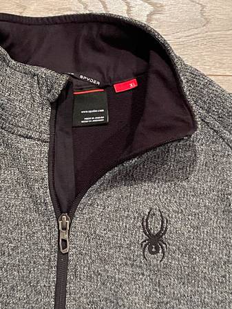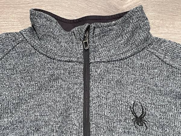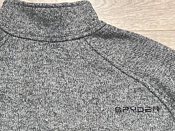 Men's US XL/EU 54 SPYDER "Outbound" Half-Zip Pullover. This mid-weight, long-sleeve shirt/sweater in charcoal gray color with heather pattern and black trim combination creates a stylish look. The mock neck and half-zip closure provides warmth and easy on/off comfort. Great layered clothing for skiing or other outdoor activities. Embroidered with the Spyder logo on the chest and name on the backside. $35 cash only