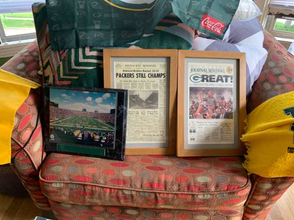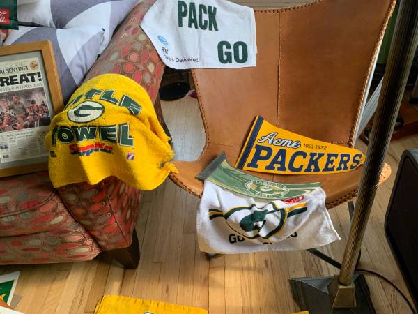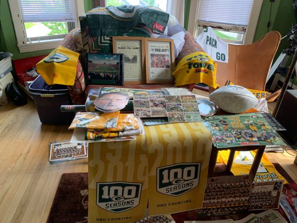 Large collection of Packer Season ticket holder/stockholder swag along 1998 team knockoff signed football, #4 collector plate, posters,cards. Flags, Framed Pieces. Banners. Window shades. Many Duplicates. Basically the kinda things a Packer Bar/Room would require for decorating Downsizing and just looking for a new home for it all. Reach out if you want more info.