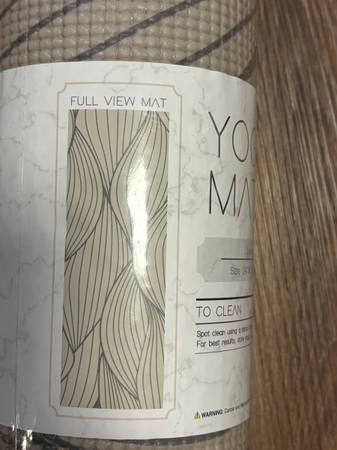 24"w x 68"l Yoga Mat - Beige with beautiful calming curved line design Brand new. Sealed in original packaging. Lightweight and durable. Non-slip surface 24" wide x 68" long.