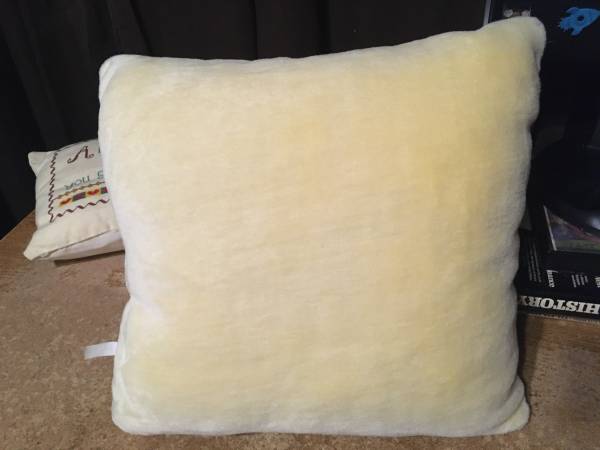 VERY GOOD CONDITION. BEIGE PILLOW WITH A BEAR IN A RED VEST WITH A GOLD TRIM.