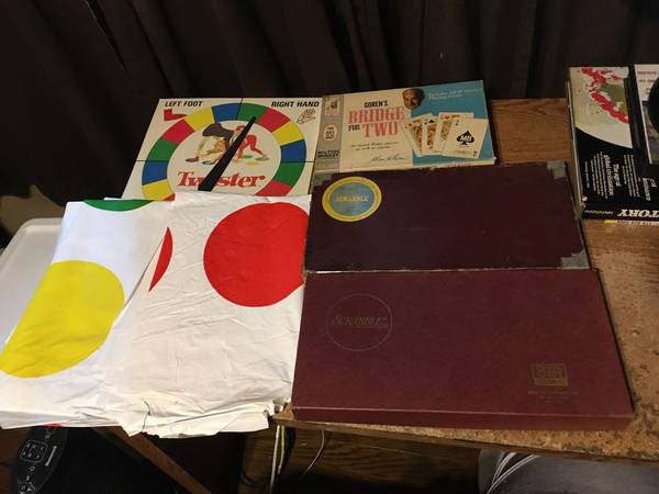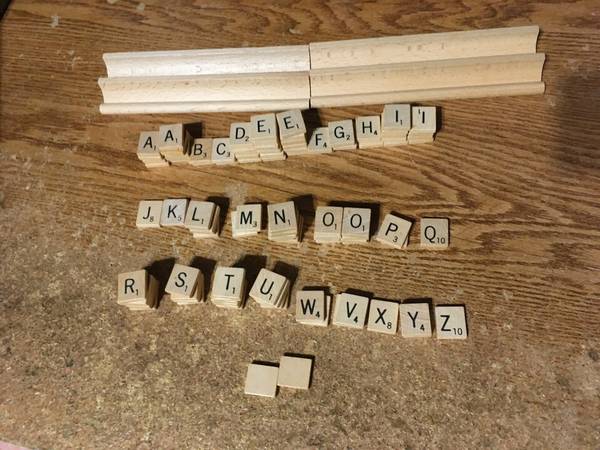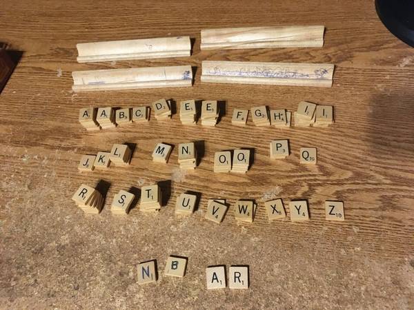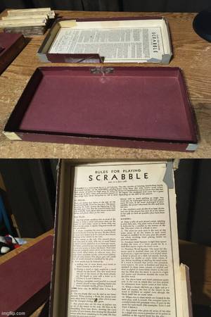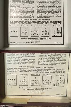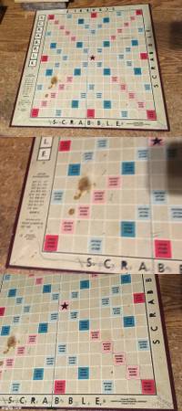 1953 HAS A F AND U TILE MISSING, HAS AN EXTRA A AND R, BLANK TILE HAVE WRITING ON THEM LETTER HOLDERS HAVE WRITING ON THEM, BOX IS IN BAD CONDITION WITH A PART MISSING, HAS BEEN TAPED. THE BOARD HAS WRITING ON IT, ADDED AN A AND F