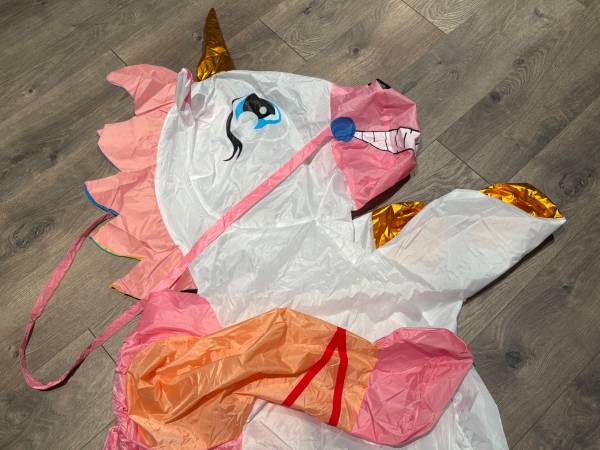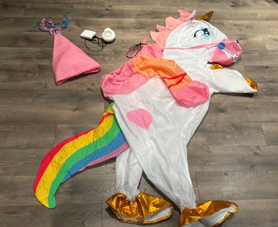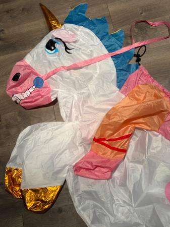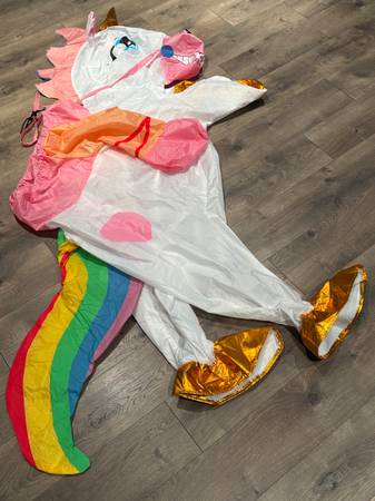 With this riding unicorn Halloween costume, you can be the center of attention with this fun, colorful outfit! ONLY WORN ONCE for less than 2 hours and in EXCELLENT CONDITION with no stains, tears, or worn areas from a clean, smoke- and pet-free home.