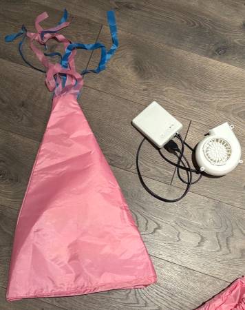 Once you step into this costume and inflate it, you can see the multicolored mane, princess faux legs down each side of the unicorn. When you hold the reins, it gives the illusion you are the princess! Your legs are the unicorns back legs and the hooves hide your shoes. The costume comes with an air pump for easy inflation, along with a coordinating, cute fairy hat. The air pump includes a portable power bank or you can insert 4 AA batteries.