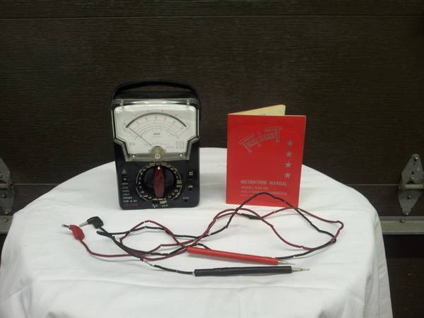 This meter is for the electrical enthusiest or collector. It needs repairs because some of it's features don't work. It is sold as is that a skilled technition should be able to repair. The bakelite case is in very good condition with a small chip in the back and a small piece of bakelite missing from the top. The front panel glass and selection knob are in great shape. Leather strap is like new condition. Great for parts or to put on display even if it's not repaired. Complete in original box with owners manuel and testing cords. Please note that the testing cords would have to be replaced because they are dried out. Contact me with any questions or concerns. Thanks for viewing my post.