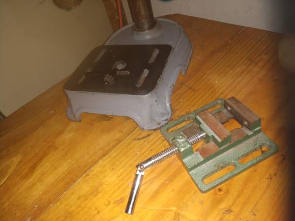 Table model, option to buy rolling table to mount. Includes key and mini drill vise. Option to buy multi angle vise