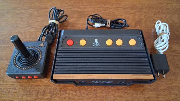Includes power adapter, A/V cables (attached to the console), and one joystick