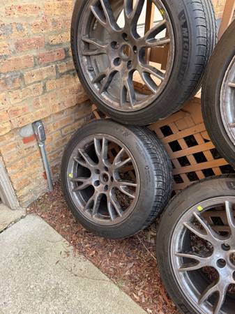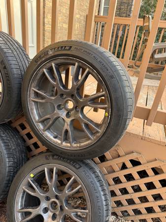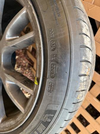 Set of 4 wheels, all season tires and sensors off a 22 Model S which was traded in with winter tires. Minor curb rash but no bends or repairs or unusual tire wear. Michelin All Season 4s are stock size rear 285/40/19 and front 255/45/19 and have about 25k miles of wear. Tires are rated for 45k miles. TMPS sensors included.