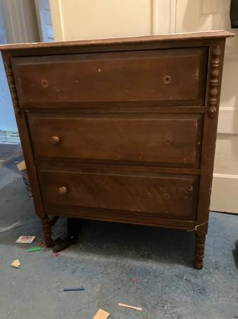 1. Solid wood dresser with 3 drawers that needs some repair. It's over 60 years old and probably older. 36 tall and 19" deep and 32" wide