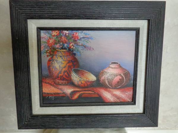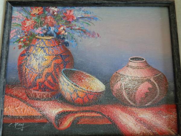 Artist C. Kay 8 x10 WALL DÉCOR (#0292) numbered #326 Princes and was Made In MEXICO. It is framed in a black wooden frame, measuring 15 ½ by 13 ½ inches and matted in a canvas matting inside another wooden frame. The colors are vibrant with a cracked oil design of BEAUTIFUL MEXICAN POTTERY.