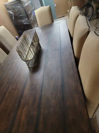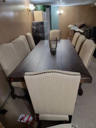Gorgeous solid wood 10 person table and 10 upholstered studded dining chairs. Mint condition. Very heavy solid wood table. You will need a pick up truck as the table is long. Cash only. You pick up....