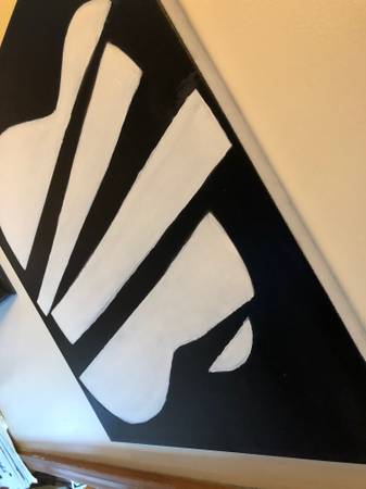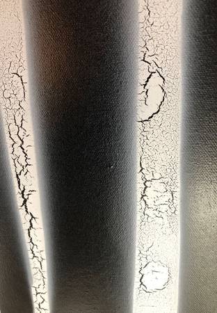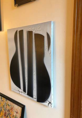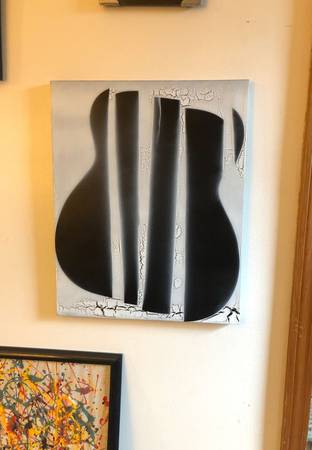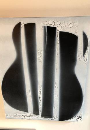 No. 1: Black and white spray over a deconstructed guitar image. 16" x 20" - $50.