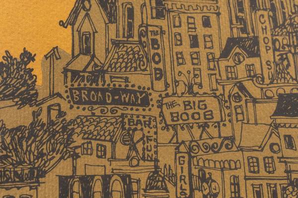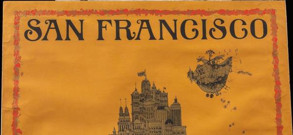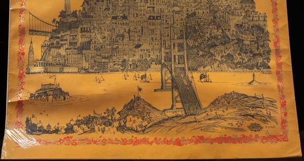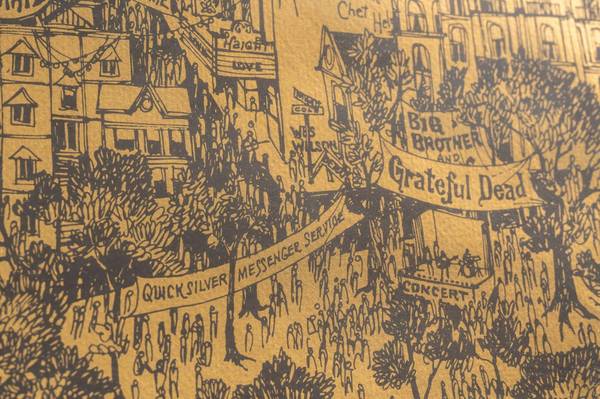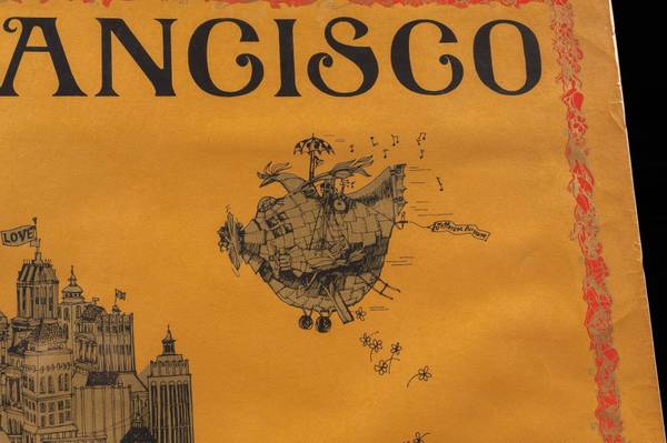 Notes: This piece takes the form of a "map" of San Francisco as viewed from the Golden Gate Bridge in Sausalito. The city is arranged in a stylized manner and covered in small banners and signs. Many bands of the day are represented on these signs and banners including Jefferson Airplane, Moby Grape, Family Dogs, and The Grateful Dead. It was released through Sparta Graphics, a joint venture started in the 1960s by music promoter Dave Schiller and art student Jim Michaelson.
