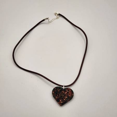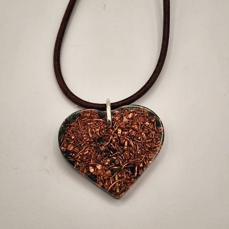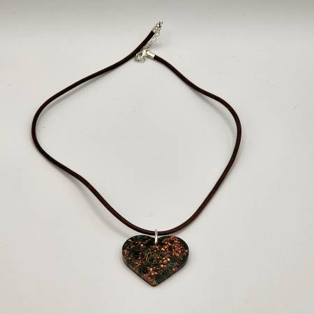 Introducing Keylume – a one-of-a-kind, heart-shaped orgonite pendant designed to transmute negative energy into radiant, life-affirming vibrations. Suspended from a brown leather cord adjustable from 18" to 20.5", this pendant features a partially hidden metal key to symbolize unlocking inner peace and personal power. Fuchsite’s healing frequency combined with copper and piezoelectric activation makes Keylume a wearable piece of functional art for energetic protection and emotional clarity.