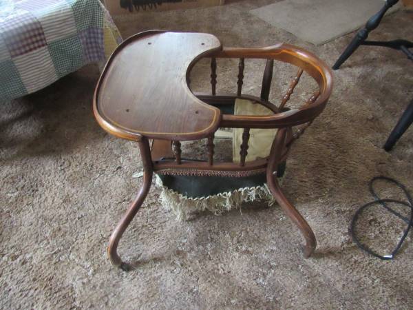 Antique Children's Victorian Wooden Walker. Walnut with Inlaid Wood. On Wheels. Cloth Seat with material with Fringes around the bottom. In Great shape.