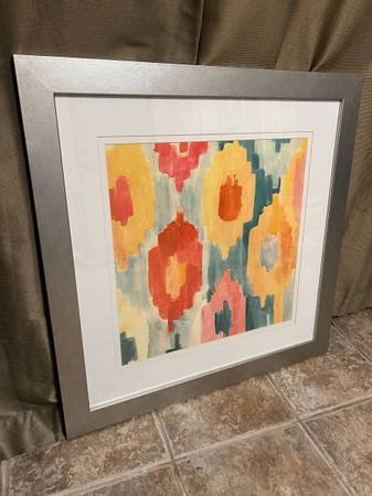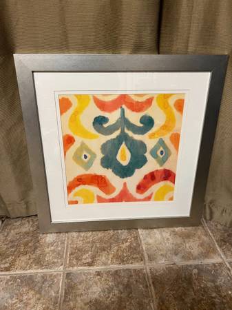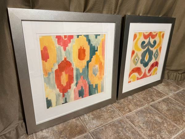 Two Matching Designer Wall Art Painting in a custom glass frame in excellent condition. Dimensions: 28" X 28" A great accent piece on any room- $165 price is for both