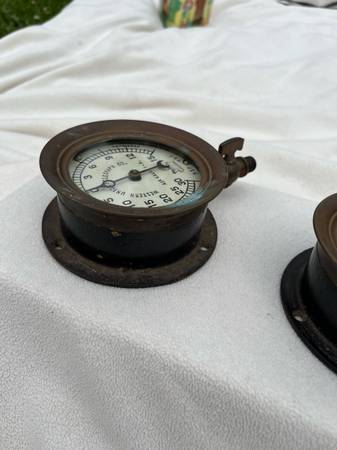 Beautiful Pair of heavy, Antique brass and porcelain pressure gauges Probably from the Edwardian period, though they could be Victorian. They are in perfect condition. They don’t do Tool & Die this fine anymore. Captain Nemo may have used them on his Victorian Submarine. They are at least from the period of the Titanic and the great age of the Ocean Liners. Great for Steampunk Art Project