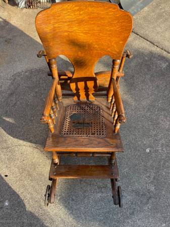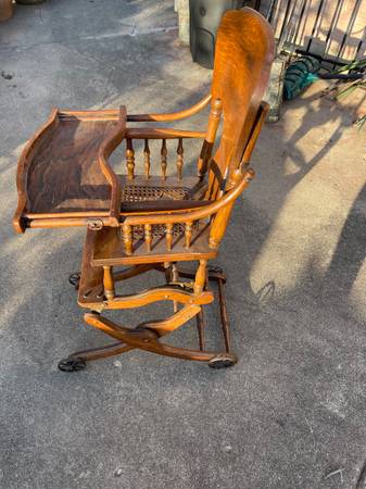 This antique baby rocking chair can be lifted up to become a high chair, and it can also be converted into a stroller. The only issue with it is that the cane seat is torn, as seen on the photos. You can place a decorative pillow on the seat to conceal it. You can even place a doll on the seat to make it look cute!