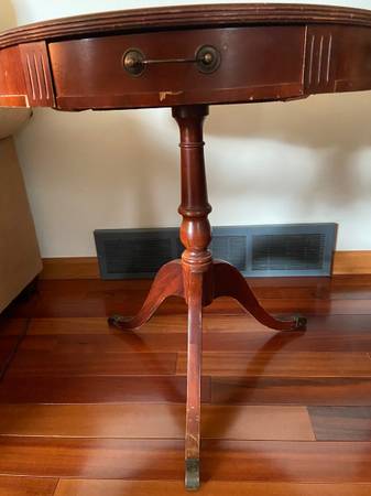 Antique round side table with small drawer. Has numbers on bottom, see picture Good overall condition but needs refinishing. pet free and smoke free home. Moving and selling several items. Please see all of my other listings. All reasonable offers will be considered.