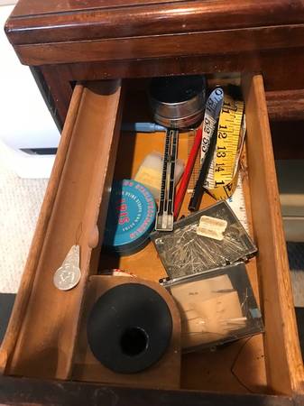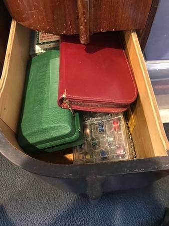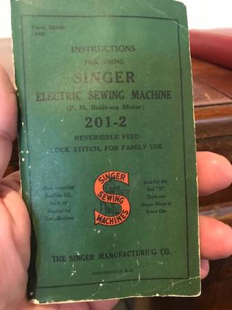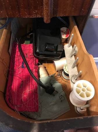 1940's Singer Art Deco sewing machine cabinet with Singer Electric Sewing Machine # 201-2, comes with a LOT of extra's!!! Includes matching storage bench. 70eight-267-one 85 eight