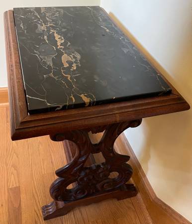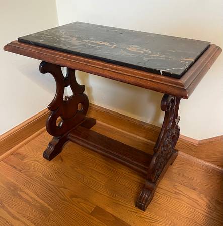 Antique marble top table by Tobey Furniture from late 1800’s W 26” x D 16” x H 22” Cash Only