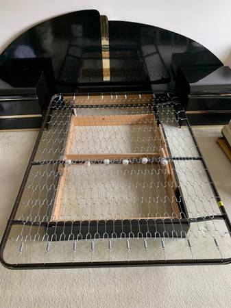 BLACK WITH GOLD TRIM QUEEN SIZE BED FRAME & Spring Top ; DESIGNER HEADBOARD AND 2 MATCHING NIGHT STANDS. GOOD CONDITION SEE PICS NOTE : pillows, sheets, comforter are NOT included ! IF YOU CAN...