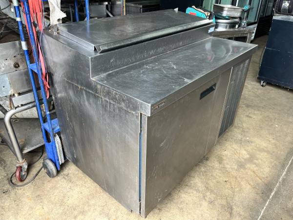 1 door refrigerated pizza prep table holds up to (6) 1/3 size pans (sold separately) to keep your ingredients fresh and on-hand where you need them most!