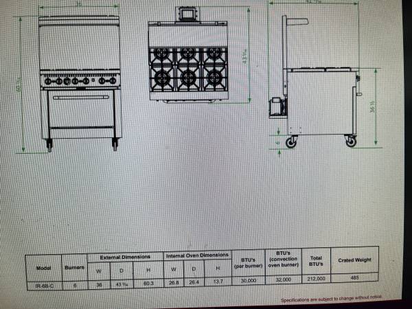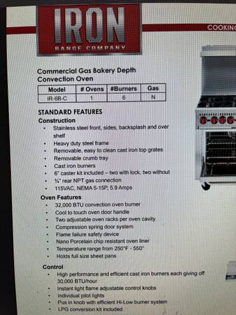 The Iron Range Commercial Gas Range with Convection Oven has powerful 30,000 BTU cast iron burners. Each burner