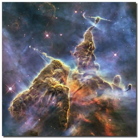 The pillar is also being assaulted from within, as infant stars buried inside it fire off jets of gas that can be seen streaming from towering peaks. This turbulent cosmic pinnacle lies within a tempestuous stellar nursery called the Carina Nebula, located 7500 light-years away in the southern constellation of Carina.
