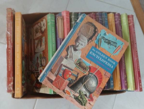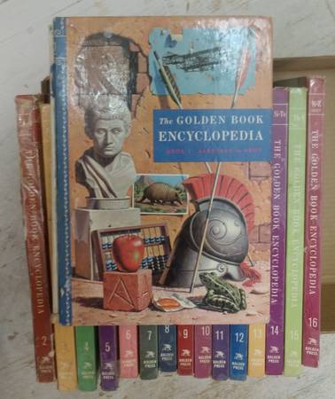Vintage 1959 The Golden Book Encyclopedia 16 volume set. Child's encyclopedia set and color illustrated. Set is in used vintage condition. The pages look good. Books measures about 7 1/2 inches by 10 1/4 inches tall. Books are in used vintage condition with wear from age and use.