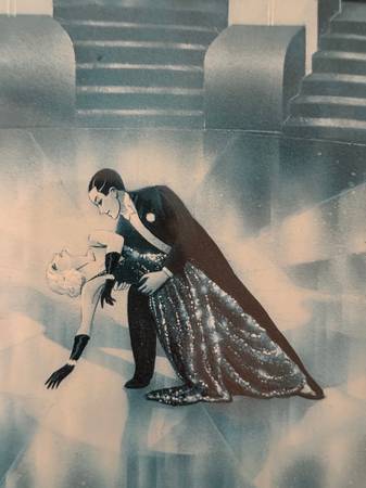 Subject: A couple dancing on a stage, set against an architectural backdrop with strong chiaroscuro lighting