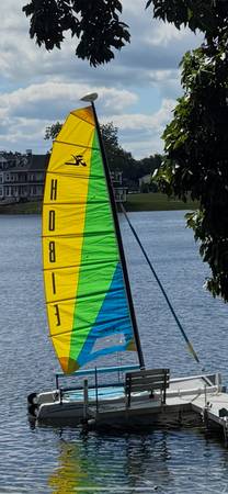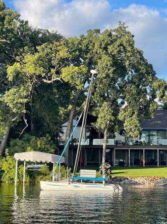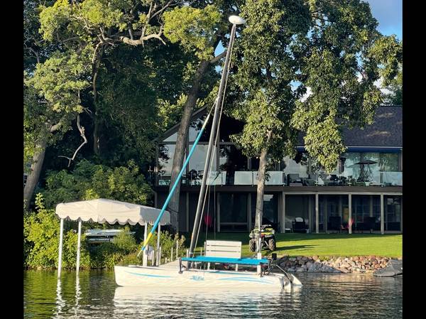 It is in very good condition, including the sails, pontoon and trampoline (pics are current). Never left in the water for extended periods as I am able to launch it from my lot. There are no cracks in the hull. It includes the wings as well which were a $2,000 addition.