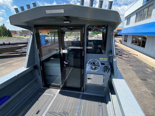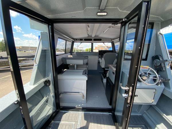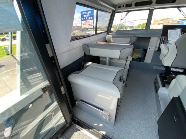 Dual French Doors, Crossover Dinette & Galley Package, Adventure Package, RiverMaster Helm seat, Flush Toilet, SST Interior Roof Grab Rail, 1/4" Hull Bottom, HD rub Rail, 125 Gal Fuel Tank, Radar Bracket, Transom Fish Locker, Upgrade Fish Locker to Livewell, SST Offshore Bow Rail, SST Reboarding Ladder, Under Deck Savwinch 150 SS Drum Winch, Battery System For Twin Engines, Stereo, Diesel Airtronic Heater/Defroster, Auxilary Station with controls for main engines and kicker.