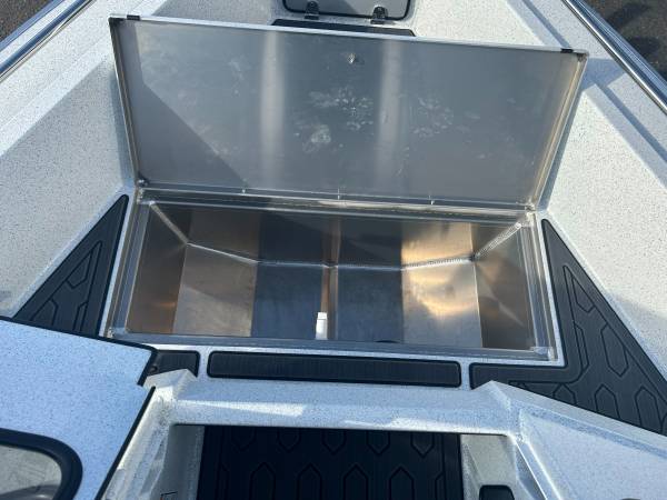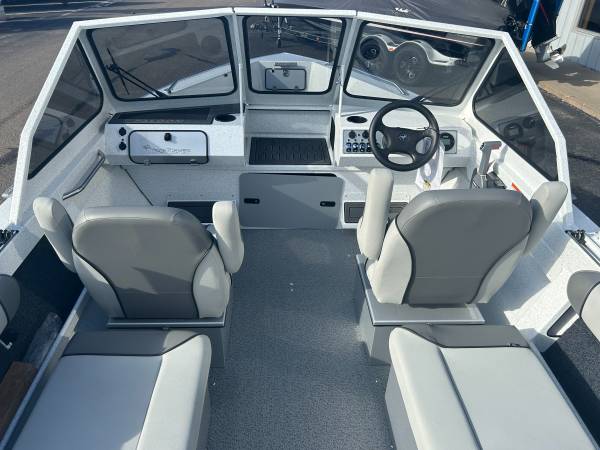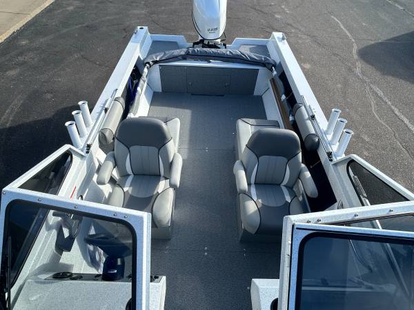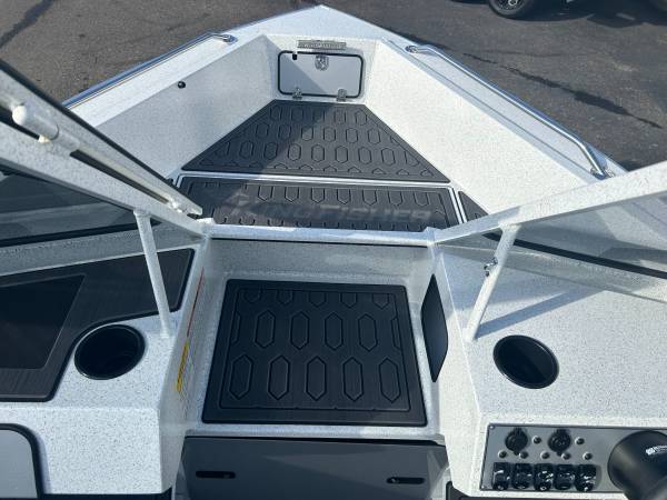 Sport Graphic Upgrade, Two Rivermaster Seats Upgrade, Two Helm Seat Boxes, Two 24" storage bench seats, Carpeted gunnel side storage trays, Gunnel mounted rod holders, Removable Ski Pylon, Welded aluminum platform with ladder, Drop Curtain w/roll up center door, Tinted windows, Additional 12 volt power point & dual USB outlet, Additional electric 1100 gph auto bilge pump, Livewell, High pressure wash down system, Windshield wipers, Accessory wiring harness, Spare tire and mounting bracket.
